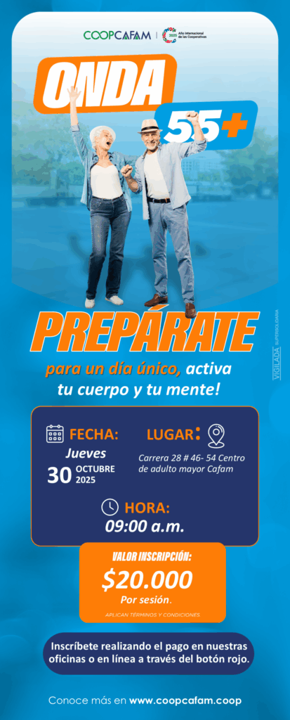 - En línea: A través del Botón Rojo. Al hacer el pago, escribe en la descripción: Onda 55+. Una vez realizado el pago, envía el comprobante al correo: eventos@coopcafam.coop
